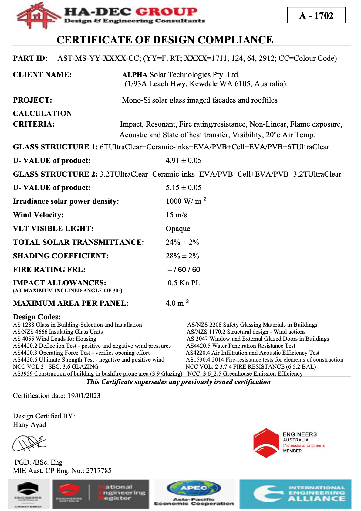 Download PDF - Certificate of Design Compliance - 1702Mono-Si Solar Glass Imaged Facades and Rooftiles