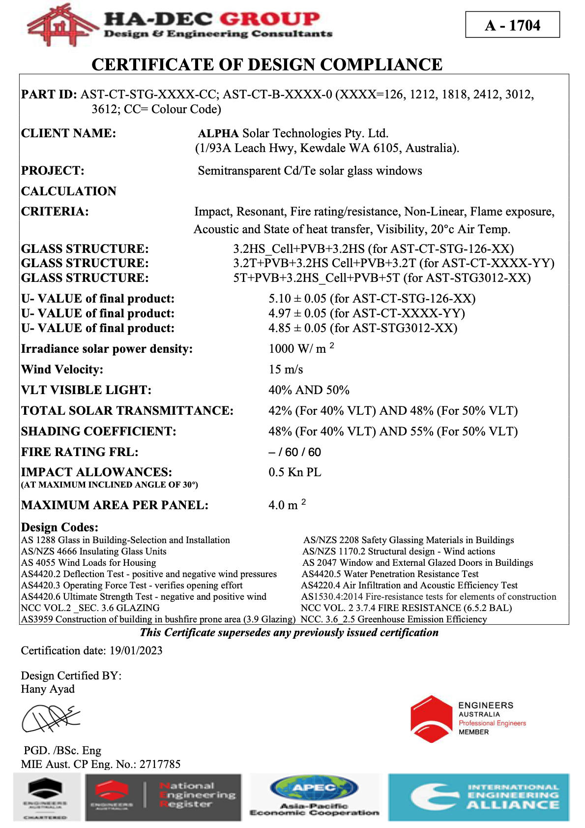 Download PDF - Certificate of Design Compliance - 1704Semi-transparent Cd/Te Solar Glass Windows
